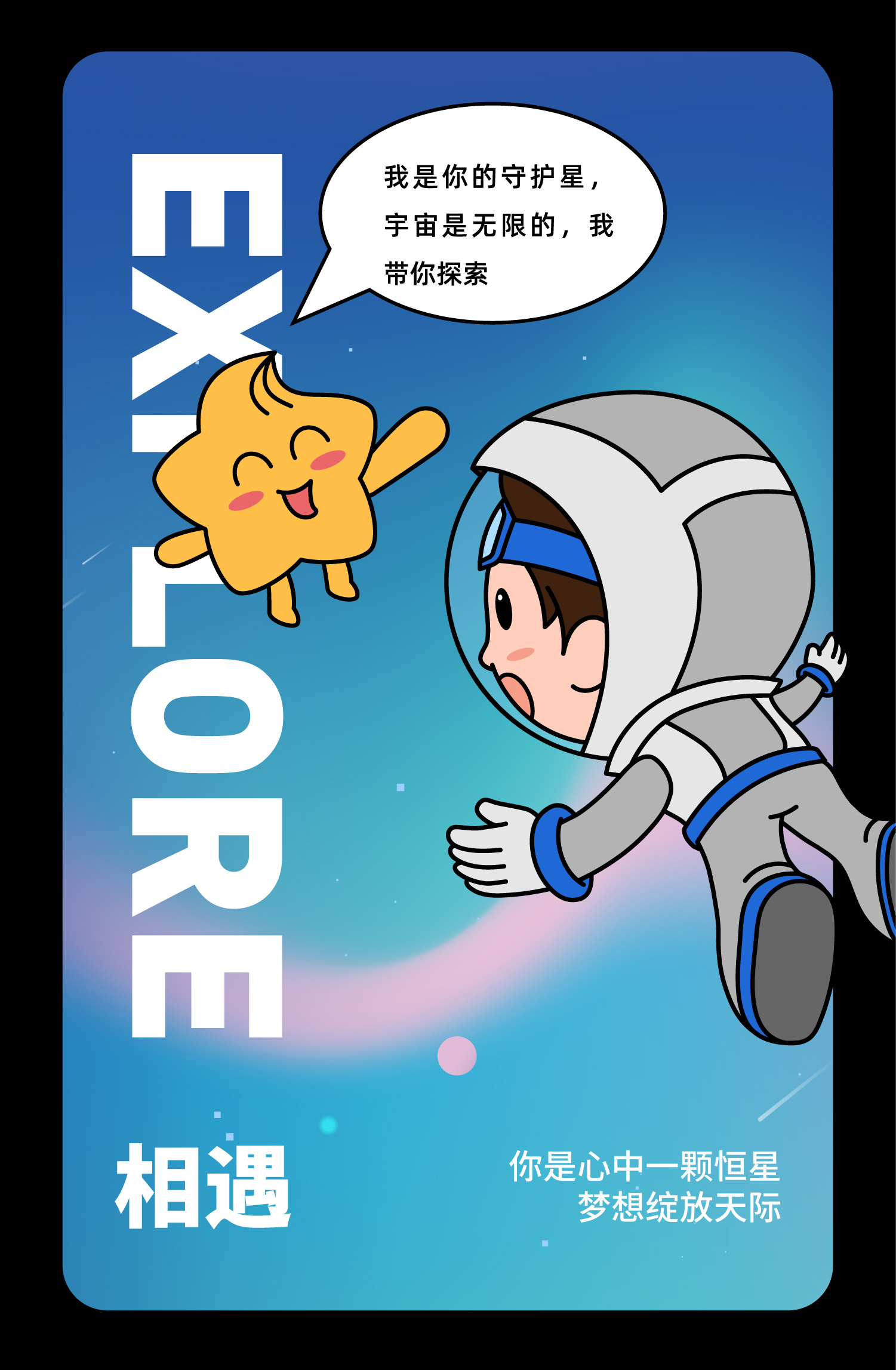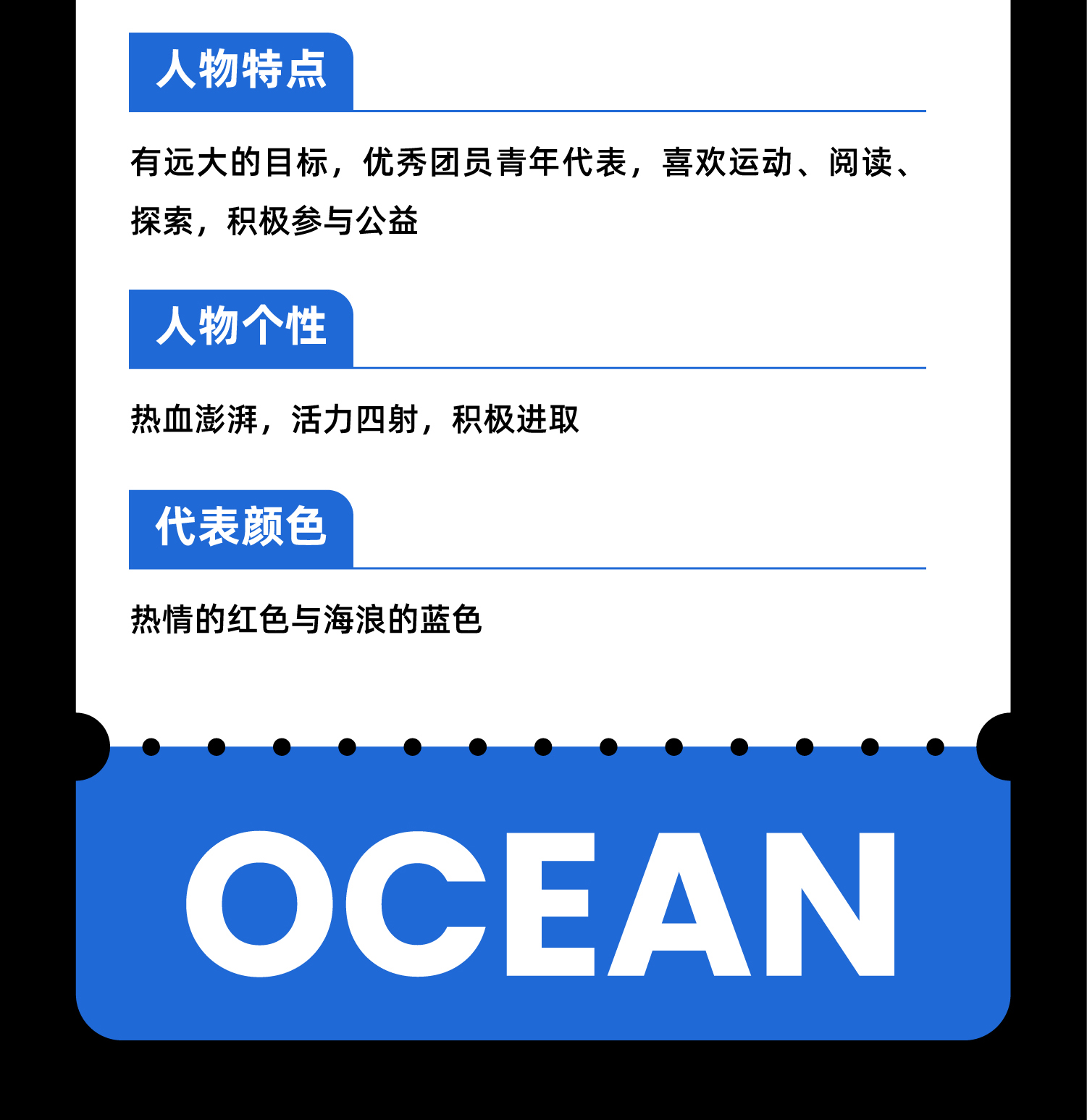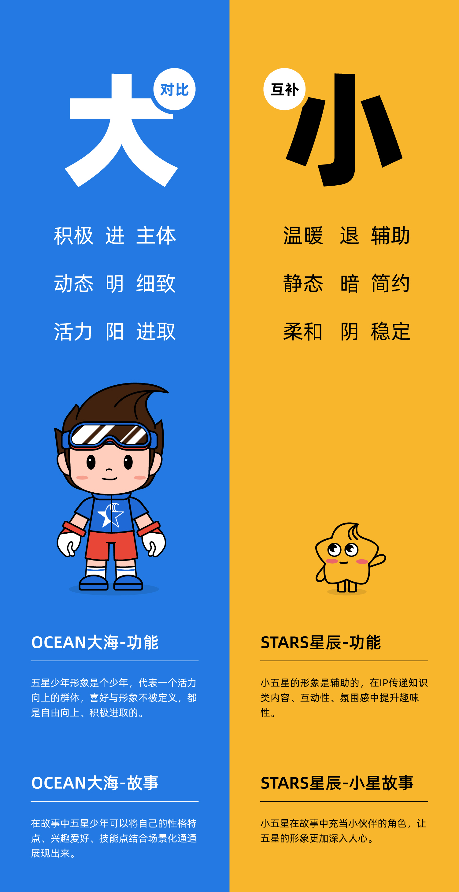 大亞灣共青團IP形象組合名稱為“星辰大海”,“大海”是一個五星少年的形象,代表一個活力向上的群體,喜好與形象不被定義,都是自由向上、積極進取的。“星辰”是一個輔助的小五星形象,在IP中傳遞知識類內容、具有互動性、氛圍感中提升趣味性。 IP形象不僅是在視覺上體現,亦可衍生實體產品,可看可觸。另外以IP形象作為主角,創作系列趣味故事。